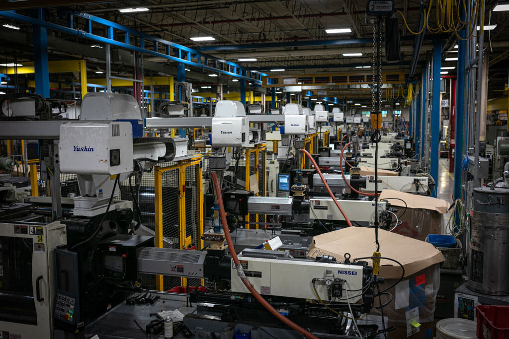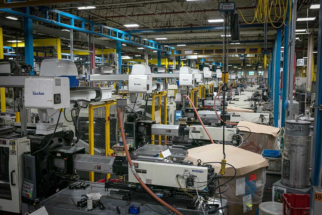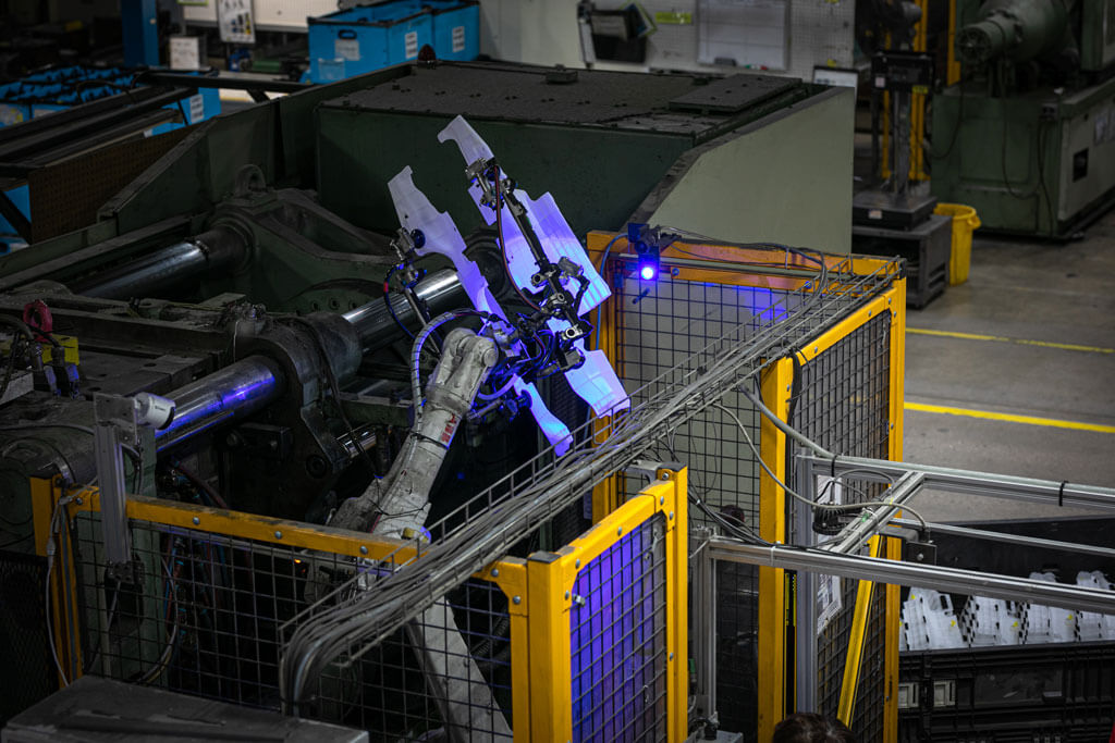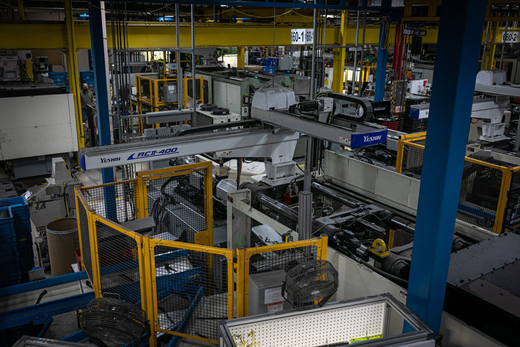 MVA uses visual automation to look at product coming off the presses for conformance with visual defects, which automatically sort out defective product. These vision systems are integrated with the various robots to automate things like over-mold insert installation into the injection tool, and secondary assembly to the part completed by the robot with aid of vision systems and automated fixtures.
